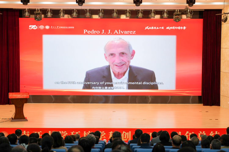 Pedro J. J. Alvarez在视频致辞中回顾了与南开大学环境学科的深厚友谊,以及共同成立环境修复与可持续发展联合中心、在污染土壤和地下水修复等重要领域开展联合科研、共同举办大型学术会议的系列成果和进展。他说,非常钦佩南开大学环境科学与工程学院所取得的成就,祝环境学科继续茁壮成长、培养优秀创新人才,为环境保护和全球地球健康作出更大贡献。