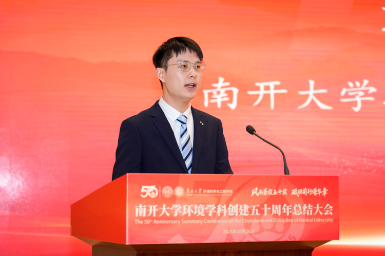 环境工程专业2022级本科生吴俊然作为在校学生代表发言。他讲述了在环境学院的求学经历及收获。他说,南开环境学科教会我们既要有“显微镜”的严谨,也要有“望远镜”的视野。在求学过程中,他深刻体会到学院培养“有家国情怀、有科研精神、有国际视野”的南开环境人的初心,未来将与新一辈南开环境人一同接过历史的接力棒,延续南开环境学科的使命与荣光。