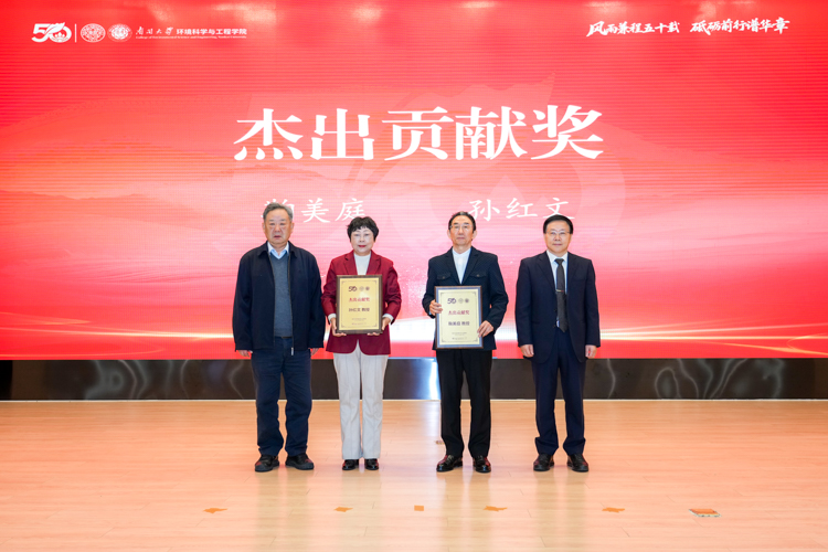 大会现场,刘丛强、张远航为“杰出贡献奖”获得者,环境科学与工程学院党委原书记鞠美庭、原院长孙红文颁奖。