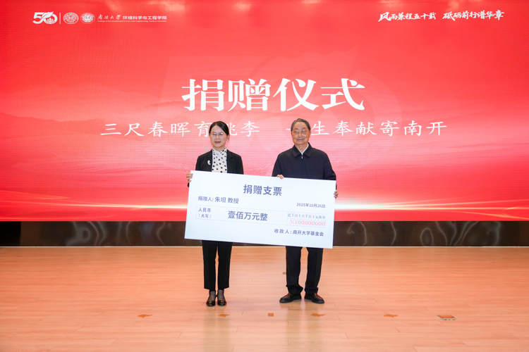 三尺春晖育桃李,一生奉献寄南开。活动现场,朱坦以个人名义捐款100万元,用于支持学院学科建设与人才培养。杨庆山为朱坦颁发“南开大学环境学科发展终身成就奖”纪念奖牌。祝凌燕代表学院接受捐赠。
