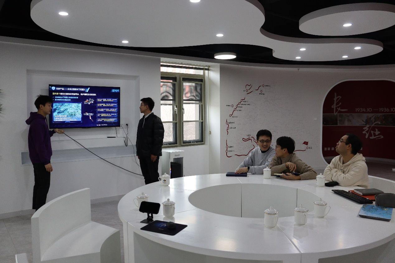 参观结束后,师生一行在活动室开展创新创业项目的讨论。项目负责人、南开大学电光学院2020级硕士生李天赐以路演答辩的方式介绍并回顾了项目历程,之后师生从项目的技术路线、市场营销、布局优化、人员分工等方面展开了深入讨论。“不止是寰海星猎一个团队,今后我们希望依托与海棠街道共建的双创基地推动新的项目落地扎根,充分发挥出基地的育人引才效果”,项目指导教师段少祥总结道。