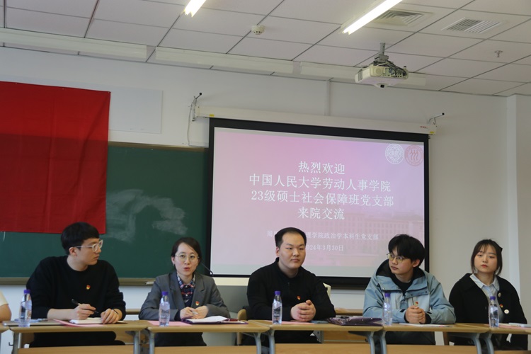 龚睿翔从“破冰座谈”“党团联学”“支委领学”“交流共建”等方面介绍了党支部组织架构和工作开展情况。东韡妍从“专业引领”“品牌活动”“党团班一体化建设”等方面分享支部工作情况。随后,双方支部成员围绕党员发展、骨干培训等实务工作展开交流。中国人民大学2023级硕士社会保障班党支部苏骄阳分享党员发展过程性培养,政治学本科生党支部组织委员全鑫分享学院党校积极分子培训班学习环节,为双方支部党建工作提供了新思路、新方法。