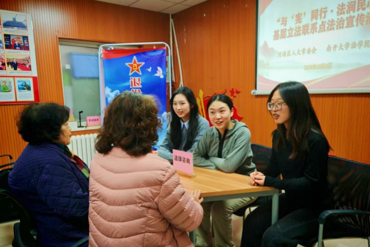 南开大学法学院学生宣讲服务队还走出校园、走进天津基层街道社区,开展宪法精神宣讲和公益法律咨询活动。南开大学法律援助协会及民法典精神学生宣讲团走进首创暖山社区,以“点亮法治之光 守护美好生活”为主题开展普法宣传志愿服务活动。12月4日,法学院与共建单位河西区人大常委会联合开展“与‘宪’同行 法润民心”基层立法联系点法治宣传活动,法学院三支学生宣讲服务团队深入河西区前程里社区党群服务中心、东莱里社区居委会和梅江街道党群服务中心,面向社区群众进行宪法精神宣讲,并在宣讲后一对一解答居民提出的法律问题,义务进行法律咨询服务。