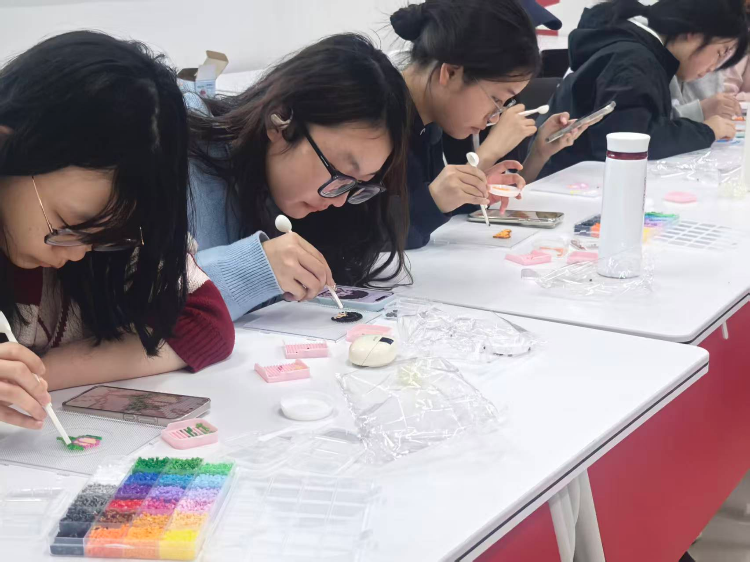 活动现场,同学们依次领取拼豆材料包,使用拼豆笔、镊子等工具进行创作。从搭配颜色、设计图案,再到查漏补缺、熨烫定型,拼豆的每一步都凝聚着劳动的专注与创造的乐趣。活动最后,不少同学拿起自己的拼豆作品交流灵感、展现独属于自己的“DIY拼豆”成果。同学们纷纷表示,通过亲手制作拼豆作品,不仅释放了学业压力,也体会到劳动与创意结合的独特魅力。