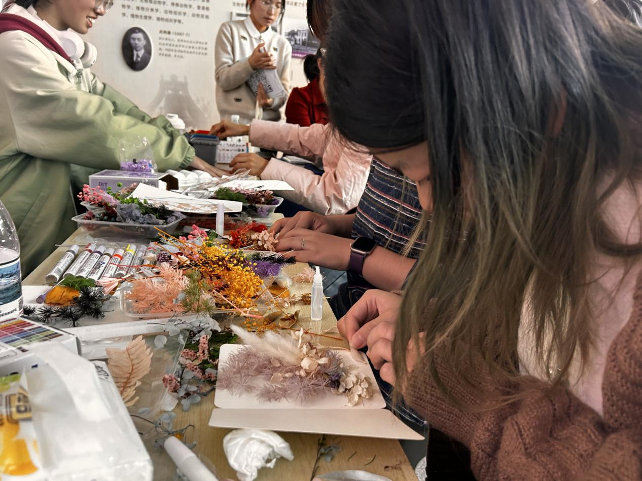 活动伊始,各环节工作人员向参与同学系统讲解操作流程与安全注意事项,志愿者引导员全程协助,同学们迅速融入探索氛围,现场同步开启多组体验环节。“叶子寻宝游戏中,同学们辨识掌状、锯齿状等多样叶形,以彩色铅笔侧锋拓印叶脉纹理,完成对植物形态学的探索。一些同学亲手制作专属叶脉书签,直观理解叶脉的输导与支撑功能。在光合作用的知识问答转盘前,同学们通过答题互动,收获光合作用趣味图解卡,让抽象的科学知识高效传递。另一些同学选择滴胶标本和干花贺卡创作,将采集的叶片、干花融入作品,把自然形态之美定格为兼具纪念意义与艺术价值的手作。在生态循环的体验区里,同学们在“垃圾分类大挑战”“降解时间轴排序”游戏中沉浸式了解落叶与塑料等废弃物的降解周期差异。