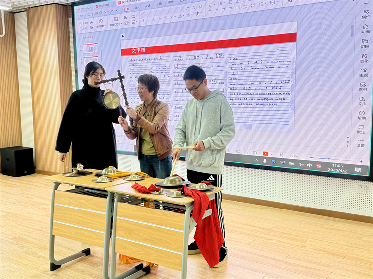 为增强学生对法鼓艺术的直观感知,讲座特别设置了互动体验环节。在王静的指导下,同学们纷纷登台试奏大鼓、铙、钹等法鼓乐器,在一招一式中体悟传统打击乐的节奏与力度。