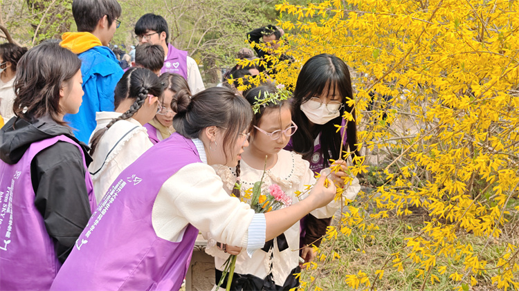 活动尾声,志愿者们以2至3人一组,陪伴视障儿童走进水上公园盆景园开展踏春游览与植物科普讲解。游览过程中,志愿者们用轻柔生动的语言,为孩子们讲述梅花的坚韧品格、玉兰的文化传说、丁香的美好寓意,同时引导孩子们用指尖轻轻触摸枝条、花苞与叶片,通过触觉与听觉的联动,让孩子们在沉浸式体验中“看见”色彩斑斓的春日盛景。此外,志愿团队还为每位孩子准备了一束鲜花,将春日的芬芳与美好亲手送到孩子们的掌心。