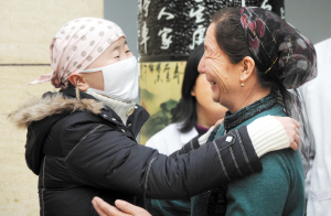 昨日下午3时30分,南开大学新疆哈萨克族白血病姑娘阿依努尔走出隔离病房,与早已守候在门口的妈妈紧紧拥抱在了一起……