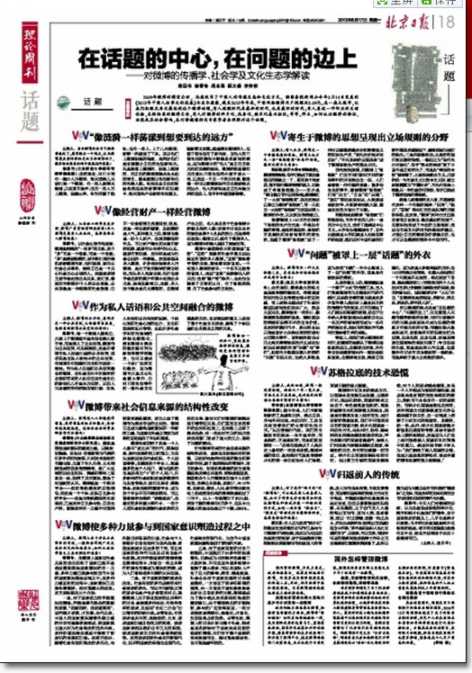 杨雪冬(中央编译局全球治理与发展战略研究中心研究员):媒体是塑造国家意识的重要力量。以佩里·安德森、安东尼·吉登斯等为代表的许多学者研究发现,印刷技术推动的书籍出版,克服了年久失传、山水相隔造成的信息传播障碍,将广大区域的民众在知识、情感和精神上联系在一起,培养了共同意识,塑造了对国家的认同。微博既是一个舆论平台这和传统媒体的功能相似,但更是一个个体、组织自主参与的平台这是与传统媒体的本质差别。正是这种自主参与性、自我生产性,使得某种单一力量不可能控制甚至操纵微博,这正凸显了微博作为舆论平台的公共性,微博正在成为重构国家意识的一种新的力量,为国家与社会之间更为对称的互动提供了平台和渠道。
