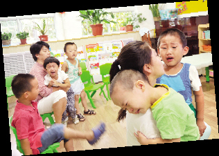 游戏结束后,老师给孩子们放动画片,此举是为了吸引孩子们的注意力,好让家长悄悄离开。当最后一个家长离开教室后,教室里顿时哭声一片,孩子们哭着抱着老师要找妈妈。老师们哄了这个哄那个。在这一片震耳的哭闹声中,只有一个小男孩淡定地坐在那里看动画片,时不时还嫌乱地捂住耳朵。孩子在教室里哭,教室外的家长则把耳朵贴在门上,努力地听着有没有自家孩子的哭声。