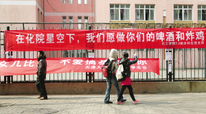 昨日早上一出门,南开大学文学院2010级的钱瑶就被校园里的各类条幅“闪到”——很多条幅是前一天晚上由男生摸黑挂起。一路走来,映入她眼帘的既有含情脉脉的表白版:“不管谁是你的王子,今天你就是我的公主,我们将全力爱护你”“在化院星空下,我们愿做你们的啤酒和炸鸡”。亦有流光溢彩的赞美版,“无论窗外多少雾霾,有文学院女生在身边就是春天”“我们今生最好的相逢,只留给物院最美的女生”。