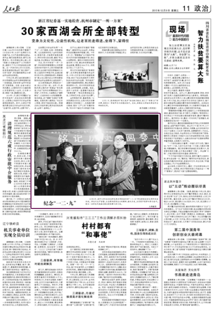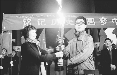 12月8日,南开大学300余名师生参加学校组织的“一二·九”学生爱国运动80周年纪念活动。师生们庄严宣誓,立志秉承爱国志士的精神,铭记历史,为实现中国梦而努力奋斗。图为一名学生代表接过象征爱国薪火的火炬。