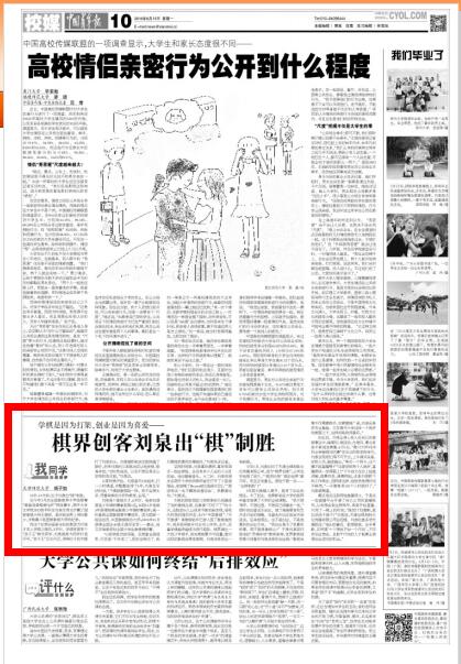 3年前刘泉踏入南开,就有了创业的想法。为了创业,他果断地在大学的前两年基本修满了大学的全部课程。“我不想考研,不想出国,只想自己闯着走一走。”那时他也曾试水创业,做了高端零食和艺术设计品的销售,也曾去河北区批发市场进货。后来他明白,这不是创业,不是他喜欢的创业方向。“我创业是为了我喜欢的事,那不就是象棋么?”于是刘泉回归到他的“灵魂伴侣”象棋身旁。世界象棋冠军蒋川很看好刘泉选择的创业路:“象棋发展不仅需要棋手,也需要推广者。刘泉自身有专业基础,又在南开大学这样一个良好的氛围之下,这样的路我很看好。”