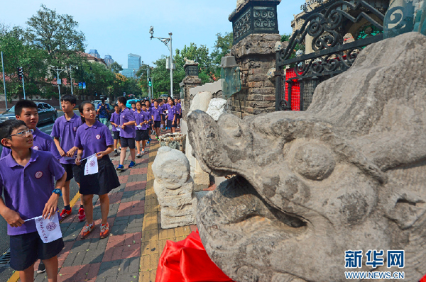 9月21日,“请大家看这座建筑,这是南开系列学校创始校长张伯苓先生的故居……”在大理道39号一幢英式小洋楼前,几位天津南开日新国际学校七年级的学生正用中英双语为同学们介绍着这里的历史和文化,他们神情专注、表达流畅,俨然化身几位小“导游”。介绍之后,他们还带领在场学生高声诵读张伯苓先生提出的“容止格言”,过往行人纷纷驻足观看。据了解,这是天津南开日新国际学校七年级正在进行的“踏寻天津五大道足迹,开启人文历史寻踪之旅”活动。在活动中,七年级60名学生分为8组,以小组合作的形式对五大道地区建筑搜集相关资料、并完成中英文讲解。