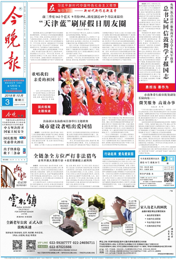 本报讯 昨日,央视《焦点访谈》栏目报道了“2017年9月14日,南开大学8名刚刚参军入伍的大学生给习近平总书记写信,表达了他们投笔从戎、报效国家的决心。习近平总书记回信勉励他们在军营大熔炉里淬炼成钢,书写绚烂、无悔的青春篇章”的故事。