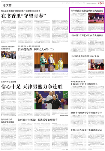 本报讯(记者翟志鹏摄影姚文生)由市精神文明办、共青团天津市委、北方演艺集团、市文联主办,天津青年宫等承办的2018中国·天津“放歌新时代”青年歌曲演唱大赛和2018中国·天津“青春梦中国梦”青年诗歌朗诵大赛,日前在南开大学落下帷幕。