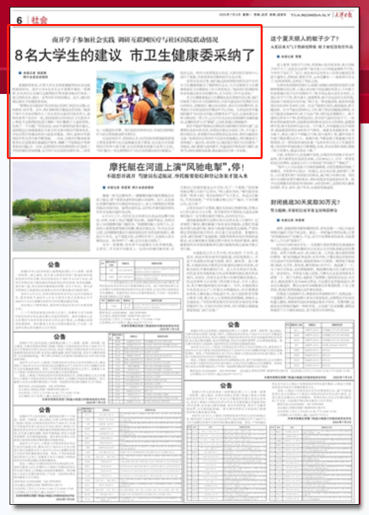 暑假即将到来,许多大学生会带着课题参加社会实践和调查研究。南开大学8名学生去年暑期开展的一项调研,针对我市正在推行互联网医疗和完善分级诊疗体系二者之间的关系,提出一系列有针对性的建议。近日,他们的建议被市卫生健康委采纳。