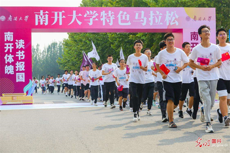 2023年9月17日,天津,南开大学"特色马拉松"启动仪式在该校举行,通过全员马拉松特色活动,旨在通过课程教学、长跑活动等多种举措,鼓励全校师生参与体育运动,增强学生体质。(沈岳摄/光明图片)