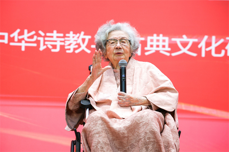 满头银发、坐着轮椅的百岁叶嘉莹先生来到年轻人中间,语调顿挫,手势豪迈,与大家相约“去攀登”“要努力”,誓将“中华诗教播瀛寰”……这是10月15日出现在南开大学的动情一幕。“中华诗教国际学术研讨会”于10月14日至16日在这里举行,来自中国大陆、中国台湾、中国香港和美国、加拿大、日本等地的近200位学者齐聚一堂,共话中华诗教的传承与弘扬,庆贺古典诗词专家、中央文史研究馆馆员、南开大学中华古典文化研究所所长叶嘉莹先生期颐寿诞。