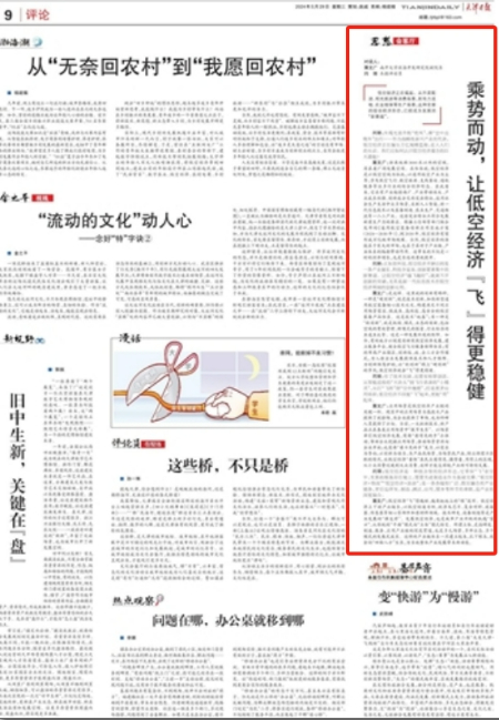 薄文广:是这样。这里说的创新有两种,一种是“硬创新”,就是技术创新,加快新型通用航空装备核心技术攻关,构建满足不同应用场景需求、低成本、高性能、高安全的低空装备产品体系。这是技术“地基”;另一种是“软创新”,就是机制、模式、业态的创新,包括空域的有效管理、新模式的探索、行业标准的互通互认等。这是一种发展环境的保障。如今,有的地方以制度创新促低空经济发展,建立服务平台,健全低空飞行服务保障体系;有的布局产业园区,创新校、政、企三方合作模式,为入驻企业发展提供技术和人才保障。为创新保驾护航,让“软创新”跟上“硬创新”的步伐,低空经济就会“飞”得更稳健。