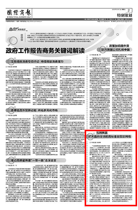 政府工作报告提出,深化多双边和区域经济合作,持续扩大面向全球的高标准自由贸易区网络。对此,南开大学APEC研究中心主任刘晨阳对国际商报记者分析称,这既是新时代以来中国参与国际经贸合作一以贯之的政策,也是顺应经济全球化和区域经济一体化发展趋势的有力举措,不仅为中国经济发展注入了澎湃动能,也为全球经济发展作出中国贡献。