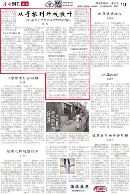 从察院胡同的四合院梦想到南开园的迦陵学舍,叶嘉莹先生以百年人生践行“终生从事古典诗词教学”。迦陵学舍这座书院不仅是物理空间的嬗变,更象征着中华文化从寻根到开枝散叶的历程,在数字时代续写着“兴发感动”的诗意传奇。