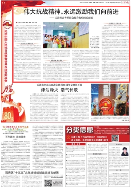 金秋九月,天安门广场旌旗如林,铁甲列阵。纪念中国人民抗日战争暨世界反法西斯战争胜利80周年阅兵盛典,以举世瞩目的雄姿,在中华大地上镌刻下又一个历史性时刻。电波所及,海河两岸热血沸腾。从社区到乡村、从机关到高校、从企业到军营,天津社会各界群众收看收听阅兵直播,共赴这场跨越时空的精神之约。当80响礼炮在首都上空响彻云霄,当受阅方队踏着铿锵步伐走过天安门广场,当先进武器装备携雷霆之势驶过长安街,津沽大地的每一个角落,都激荡着同一种情感——那是对英烈的深切缅怀、对和平的无比珍爱、对祖国的万丈豪情。