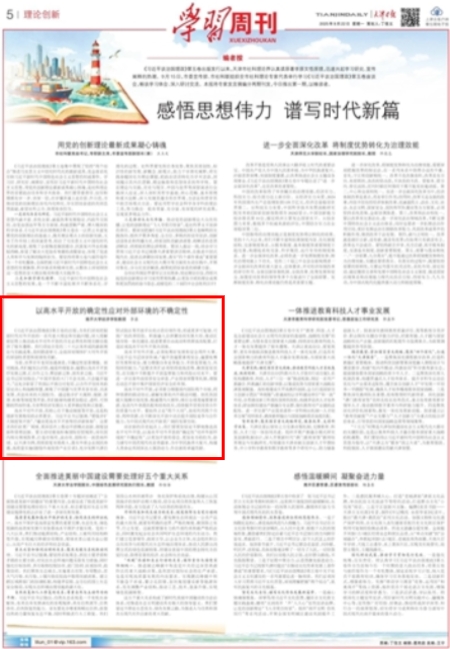 《习近平谈治国理政》第五卷的出版,为我们深刻把握新时代对外开放的一系列重大理论和实践问题,深入理解新征程上推动高水平对外开放的历史必然性和现实路径提供了根本遵循。我们须结合党的二十大以来形成的最新理论与实践成果,及时跟进学习、全面深刻领悟扩大对外开放的原创性思想和原理性贡献。