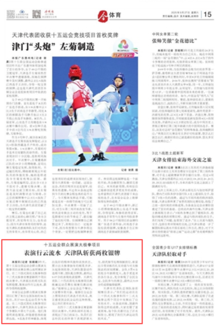 本报讯(记者 张璐璐)昨天,第十五届全国运动会群众展演太极拳项目决赛在佛山高明赛区举行。在二十四式简化太极拳和四十二式太极拳竞赛套路两个项目的决赛中,天津派出的两支队伍发挥稳健,集体动作行云流水,最终夺得两枚银牌。