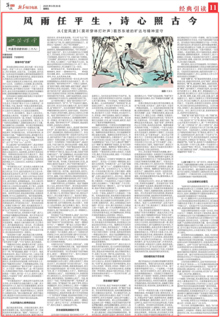 这是苏东坡写得非常好的一首小词,把大自然的景物跟他内心的修养完全结合起来了。第一句就写得好,“莫听穿林打叶声”。中国古人讲修养,说“富贵不能淫,贫贱不能移,威武不能屈”,就是不管外界怎么改变,你还是你。中国古人还讲,“泰山崩于前而色不变”,就是无论外界有什么样的变化,甚至于是真的打在你身上的苦难,你都能够有内心坚持的操守而不改变。这都不是徒然的话,这是古人真的用他们平生的行为、品格给我们证明了的。