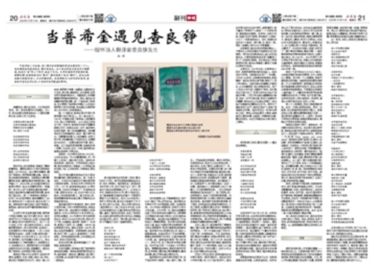 我跟查良铮先生虽说不认识, 但是阅读查先生的译著, 让我受益良多。后来有幸认识了周与良先生,有机会去她家里拜访,周先生把查先生上世纪50年代出的那些诗集,比如《普希金抒情诗》一集二集,还有一些长诗,借给我阅读,我就对着俄语原文,看他怎么翻译,然后又对照他上世纪80年代初的修改本,看他怎么样修改加工,这个过程让我十分受益,印象深刻。我大概用了一年多的时间细心阅读,后来写了一篇文章《形神兼备,精益求精——查良铮译普希金抒情诗的探索与追求》,这篇文章比较长,有27000字。2006年南开大学文学院开学术研讨会,有缘认识《诗探索》主编吴敬思,我把这篇论文交给他,希望他过目指点。结果他审查后发表在《诗探索》2008年第一期。