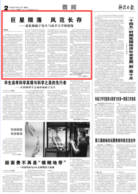 回首往昔,我深深感到,南开理论物理研究室的发展,是杨振宁先生科学报国情怀的生动体现。他从研究方向、人才引进、经费筹措、设备保障到学生培养等多个层面,为研究室的生存、发展和壮大提供了不可或缺的关键性支持。先生的离去,是中国乃至世界科学界的巨大损失。但他的学术思想、他的人格风范、他对后辈的提携与对南开的深情厚谊,将永远铭刻在我们心中,激励着我们继续前行。杨振宁先生千古!