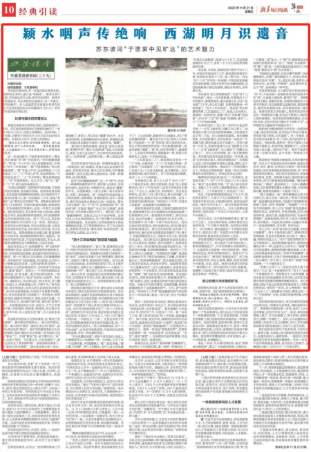 苏东坡说现在有谁还怀念欧阳修?老早就把欧阳修忘记了。所以他说“与余同是识翁人,惟有西湖波底月”,只有在西湖水光的映照之下,水底的明月会跟我一样记得欧阳修。欧阳修的词里边,常常写到清风明月。他说今天“与余同是识翁人”,唯有那“西湖波底月”,所以他是写得很悲哀,而这么超逸、潇洒,他没有说我今天断肠、悲哀、流泪。他的《念奴娇》写的是“一尊还酹江月”,所以他回到大自然,很超逸,很潇洒,可是他不是不悲哀,他是有悲哀的,这是苏东坡的一种特色。