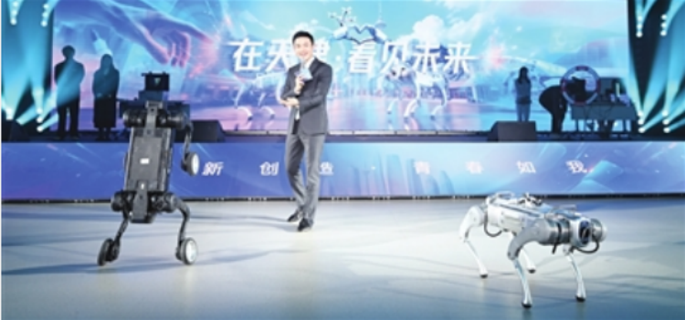 活动第二篇章展示津门炫酷科技成果。 图为伽利略机器狗跳跃站立,与人互动。