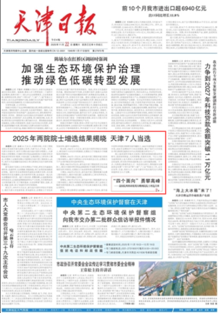 本报讯(记者 姜凝)11月21日,中国科学院、中国工程院分别公布2025年新当选院士名单,天津7位人才当选。其中,天津大学胡文平、南开大学陈永胜当选中国科学院院士,天津科技大学程博闻、中国医学科学院血液病医院(中国医学科学院血液学研究所)程涛、中国兵器工业集团第七〇研究所王增全、中国核工业集团有限公司雷增光当选中国工程院院士;此外,南开大学法国籍专家皮埃尔·阿戈斯蒂尼当选中国科学院外籍院士。