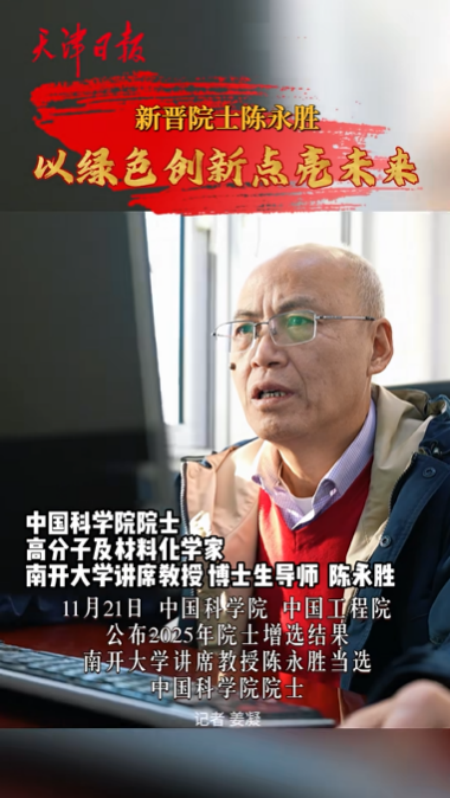 11月21日,中国科学院、中国工程院公布2025年院士增选结果,南开大学讲席教授陈永胜的名字出现在新当选中国科学院院士名单中。消息传来,南开园内外一片欢腾。这位深耕功能有机高分子/碳纳米材料及其在能源转化与存储领域研究20多年的科学家,用一次次刷新世界纪录的科研突破、一项项沉甸甸的学术成果,诠释了其科技报国的家国情怀。