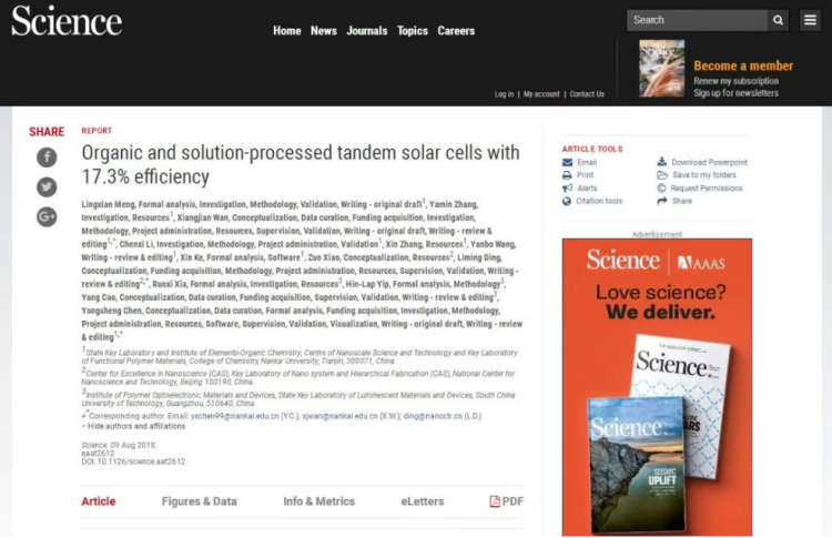 突破并未止步。从5%左右到超过10%,到2018年国际著名学术期刊《科学》刊文报道的17.3%,再到目前的20%以上,陈永胜带领团队多次刷新了文献报道的有机/高分子太阳能电池光电转化效率的世界纪录,把有机太阳电池的研究推向了一个新高度,大大提升了人们对有机太阳能电池的信心。他们提出的设计理念和方法、发展的结构单元等被广泛应用,他们在国际著名杂志上发表的数百篇学术论文、获得的数十项授权发明专利,使我国引领了有机太阳能电池领域研究和发展。