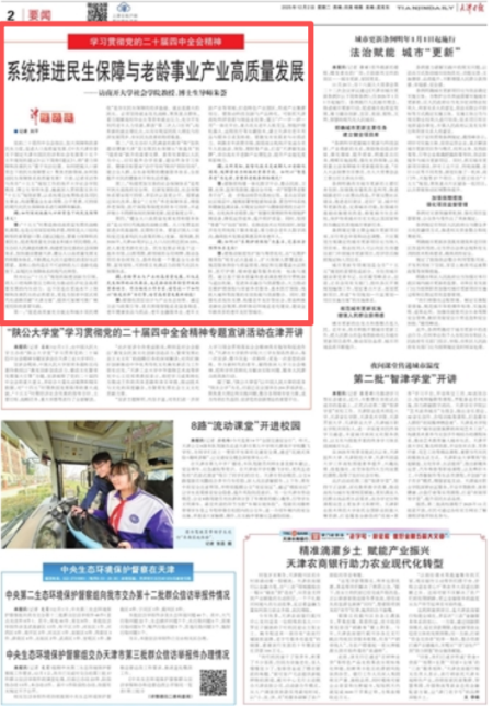 党的二十届四中全会指出,加大保障和改善民生力度,促进人口高质量发展。《中共天津市委关于制定天津市国民经济和社会发展第十五个五年规划的建议》(以下简称《建议》),将“着力保障和改善民生”置于突出位置。如何把握人口新常态下的民生保障要义?聚焦老龄领域,如何推动民生保障体系高质量发展?日前,记者采访参与我市“十五五”规划工作的南开大学社会学院教授、博士生导师朱荟,她就深入贯彻落实我市“十五五”规划部署,以系统观念统筹推进各项民生事业,构建覆盖全生命周期、公平普惠、可持续的现代化民生保障体系进行阐释和解读。
