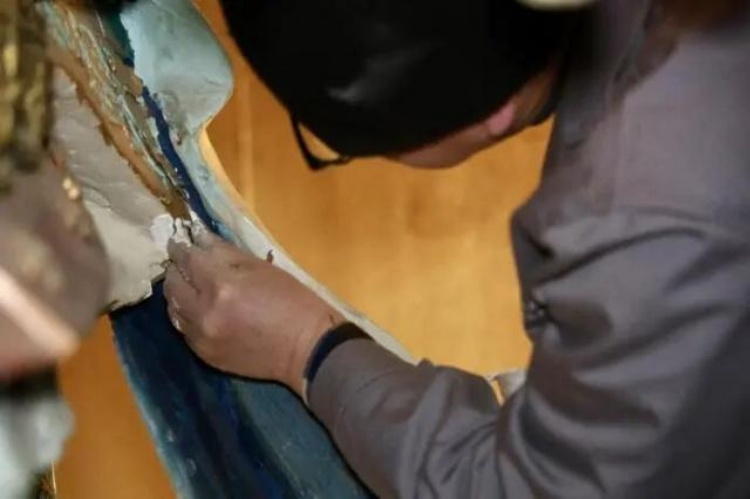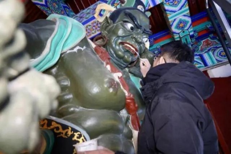 在天后宫前殿的修复现场,最引人注目的是调色盘里的各色颜料,工人师傅们认真对比,力求还原塑像原始风采。“塑像修复,不是简单复刻,而是要读懂这些塑像的‘语言’。”李佳一边说,一边用毛笔蘸取颜料,在塑像袖口处轻轻点染。笔尖落下又提起,仿佛在与塑像心灵对话。