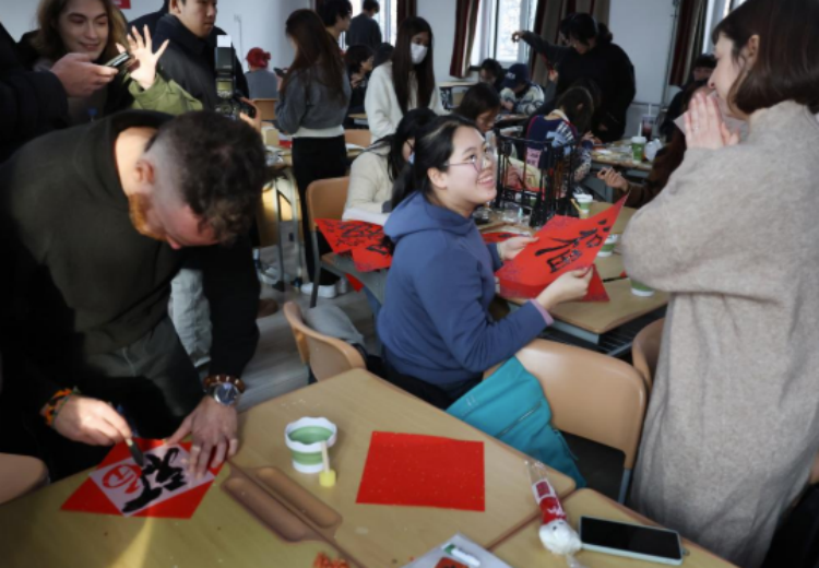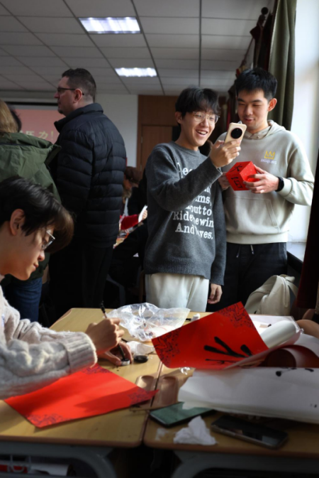 12月26日,南开大学外国语学院举办文化手工派对活动。中外师生在翰墨挥春、拓印雅趣、福运集结、灯笼寄愿、对联创作等颇具东方韵味的传统文化体验中舒缓身心、共迎新年。(记者 姜宝成 摄)