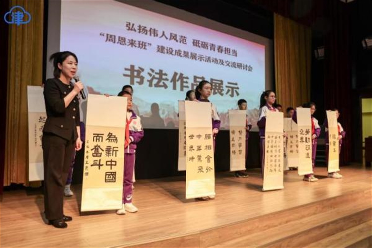 河北区红星路小学师生创作了十一幅周恩来名言书法作品,在活动现场进行了展示。来自七所大中小学的“周恩来班”学生代表及纪念馆宣讲团带来了形式多样、内涵丰富的精彩展示。宣讲、朗诵、合唱、情景剧等节目相继呈现,以青春视角讲述伟人故事、传承红色基因。