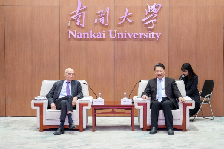 陈雨露对托马斯·贝利一行的到访表示欢迎,并介绍了南开大学的办学历史、学科特色与育人成果。他指出,南开大学与哥伦比亚大学渊源深厚。1917年,南开大学创校校长张伯苓曾专程赴哥伦比亚大学教育学院作为期一年多的系统考察,其间形成的现代办学理念对南开大学的创立与发展产生了深远影响。张彭春教授、何廉教授、蒋廷黻教授、凌冰教授、应尚德教授、喻传鉴教授等南开著名学者都是哥伦比亚大学教授或校友。这段跨越百年的学术源流,为两校奠定了坚实的历史纽带与情感基础。当前,南开大学依托新成立的全球产业与科技赋能研究院等平台,积极探索科教融合与产业创新的新路径。哥伦比亚大学教育学院在推动全球产业学科发展方面的倡议,具有重要的时代意义与前瞻价值。希望以此次访问为契机,推动双方在产业学科建设、教育与产业融合等领域,开展更深层次、更富实效的合作,共同为全球发展作出应有贡献。