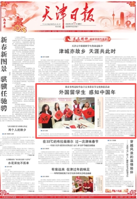在天津师范大学举行的“语通中外 同贺新春”2026年天津市中外学生共话佳节团圆活动,是我市首次专为海内外学生打造的新春主题跨文化交流盛会,以“春节团圆”为主题,依托非遗传承这个文化载体,来自天津市国际中文教育联盟的十多所高校留津的中外学生联袂呈现了一场精彩纷呈的文化盛宴。肯尼亚留学生与天津小朋友合唱的《我在天津等你》拉开活动序幕,传递着天津的热情好客;《中国功夫》《海河津韵传五洲》等节目,则将中华体育精神与运河文化赋予天津的独特魅力展现得淋漓尽致。来自天津中医药大学的孟加拉籍博士夫妇孟非凡与宝丽高歌的一曲《看起来很美》,赢得满堂喝彩。来到中国留学的他们,如今已在天津度过7个春节。“春节的魅力在于以文化引发共鸣。”夫妇俩表示,虽然语言、肤色或许不同,但人们对温暖的渴望、对交流的需要,都是彼此相通的。