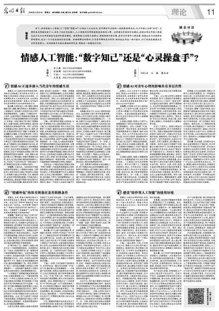 主持人:当前,情感AI展现出堪比人类的共情表达能力,塑造着一种新型人机关系。这也引发了学界对“情感外包”双刃剑效应的广泛争论。如何理解“情感外包”?情感AI究竟是青年的“数字知己”,还是一个隐藏的“心灵操盘手”?如何才能更好地发挥情感AI的积极功能?