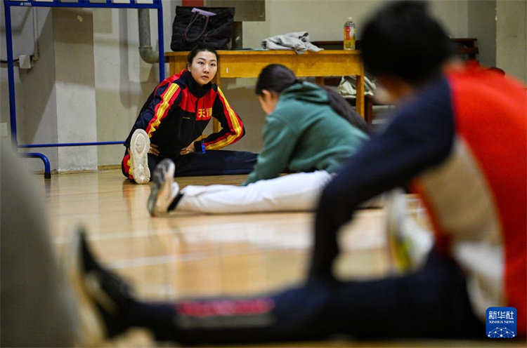 袁心玥(左)在南开大学八里台校区体育馆带领学生热身(4月10日摄)。新华社记者 赵子硕 摄