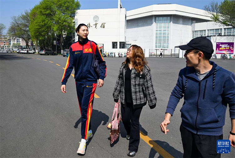 袁心玥(左)下课后和同事走出南开大学八里台校区体育馆(4月10日摄)。新华社记者 赵子硕 摄