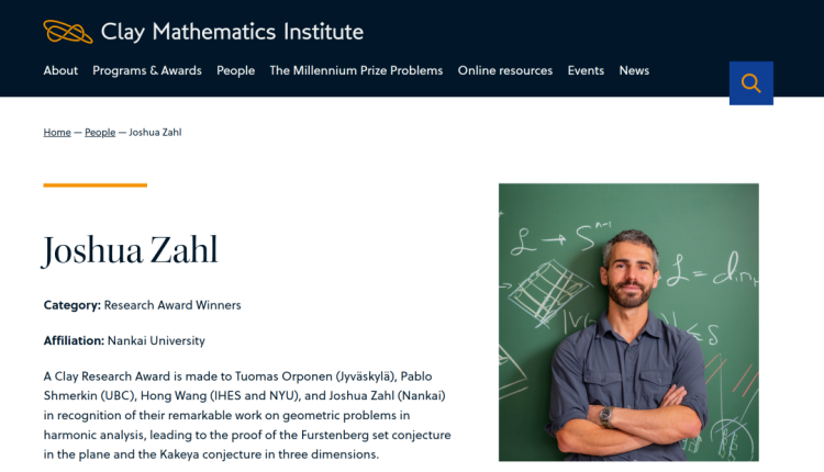 当地时间4月14日,克雷数学研究所(Clay Mathematics Institute)在其官网上公布了2026年克雷研究奖(Clay Research Award)获奖名单。南开大学陈省身数学研究所讲席教授Joshua Zahl名列其中。这是克雷研究奖首次授予在国内全职工作的数学家。