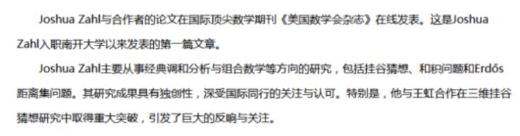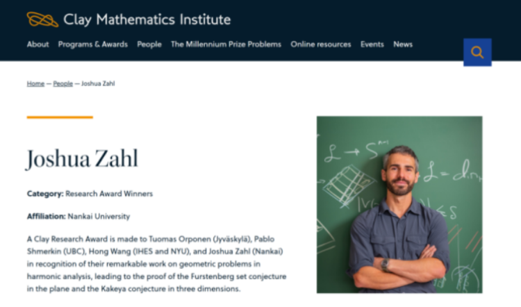 2025年6月,Joshua Zahl全职受聘南开大学陈省身数学研究所