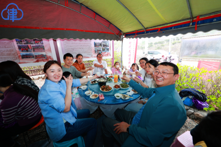 不远处,炖柴鸡、炖鱼、烀肘子、山野菜……地道的农家菜摆满圆桌,大家围坐一起“搂大席”分享本次梨花节健步走的感受。
