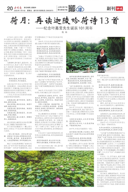 马蹄湖畔,碧叶接天,菡萏亭亭。而生于荷月元日、乳名“小荷子”的叶先生走了,唯有留下的咏荷诗词,犹在耳畔。我曾收齐了12首,让叶先生审阅过;去年先生百岁时为张静老师所著《诗词大先生》一书作序,又创作最后一首,共计13首咏荷诗词。
